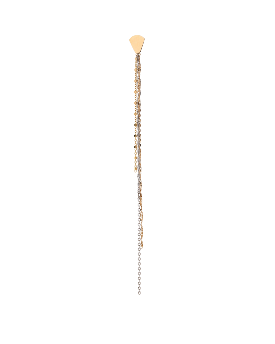 Une boucle d’oreille longue en or 18 carats caractérisé par une association de chaîne qui accompagneront gracieusement vos mouvements. Un précieux bijou à porter pour des occasions spéciales. Chaque boucle d’oreille est une pièce unique.