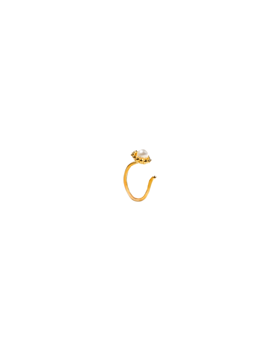Epitome of the universal feminine, Aphrodite is reborn and renews her powers through symbolic clothing. Aphrodite, whose myth is associated with beauty, embodies the qualities attributed to the materials used for this capsule: the passion of ruby, purity of pearl, and immortality of gold. This earring can be worn by itself or combined with other Atelier VM earrings.
