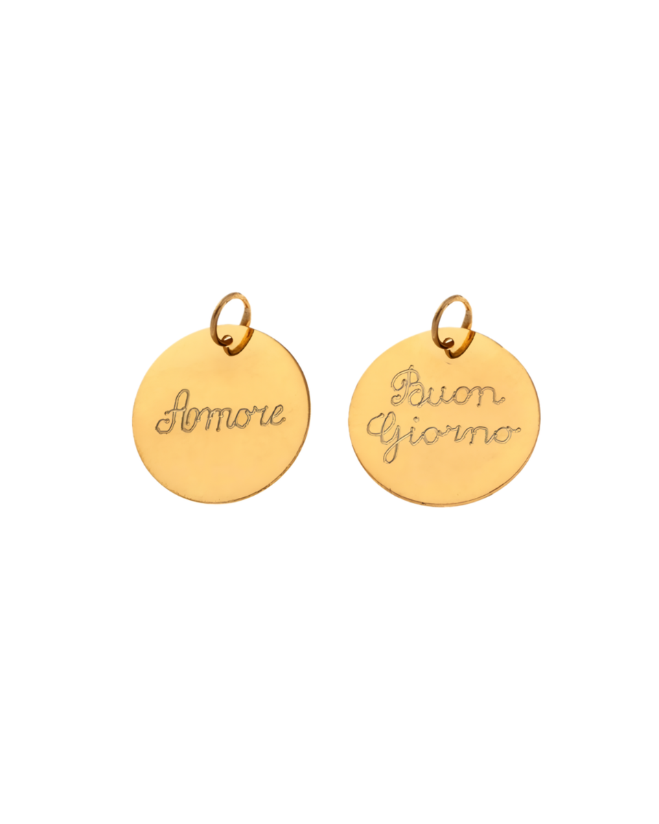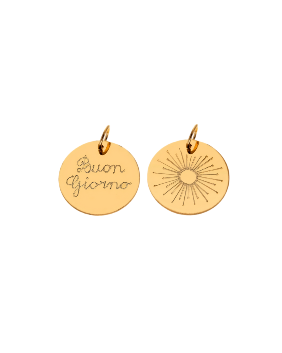 A daily reminder of love with the pure Italian romanticism of this charm. This double-sided 9kt yellow gold charm is pantograph-engraved on one side with “Buongiorno” and on the other with “Amore”.