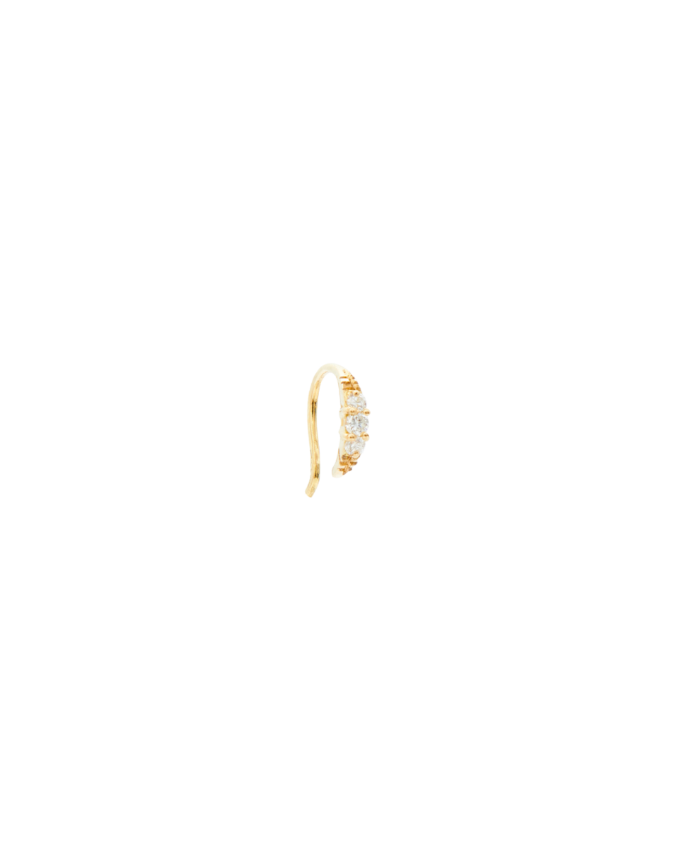 The Tappabuchi collection includes elements inspired by a trip to India. Picture a little girl, her ears studded with tiny gold jewels, suitably adorned for entering the temple. The squared design of this 18kt yellow gold and lab grown white diamond earring loops through the ear and is secured to the lobe by pressing lightly. This earring can be worn by itself or combined with other Atelier VM earrings.